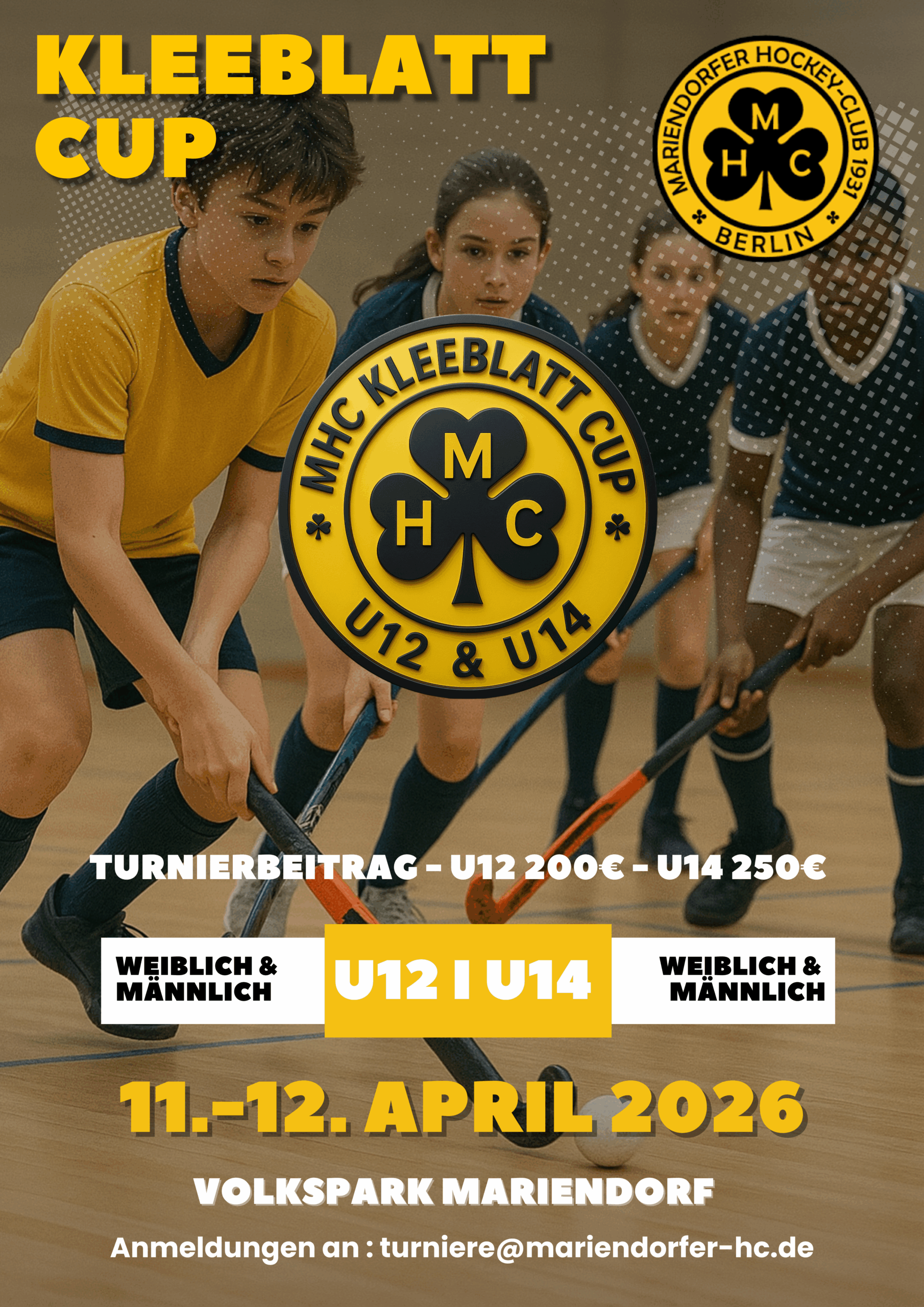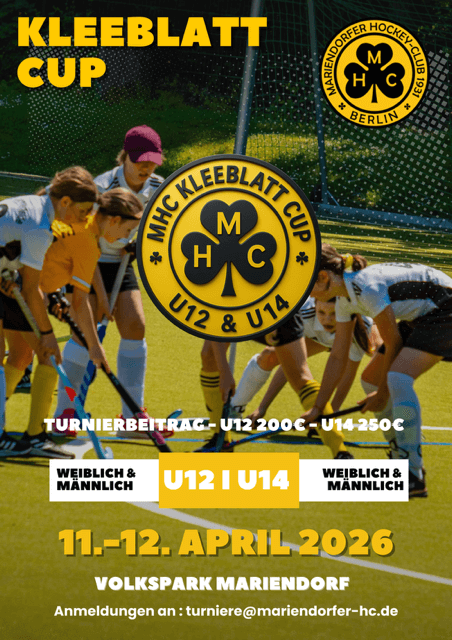 Im Frühjahr richtet der Mariendorfer Hockey-Club den MHC Kleeblatt Cup für die Altersklassen U12 und U14 aus. Bei diesem Turnier stehen Spaß am Hockey, faire Begegnungen und sportlicher Austausch im Mittelpunkt. Mannschaften aus verschiedenen Vereinen sind eingeladen, sich in spannenden Spielen zu messen und gemeinsam ein tolles Hockey-Wochenende zu erleben. Neben dem sportlichen Wettkampf sorgen unser Clubgelände, ein gemeinsames Catering und ein freundliches Miteinander für eine besondere Turnieratmosphäre.