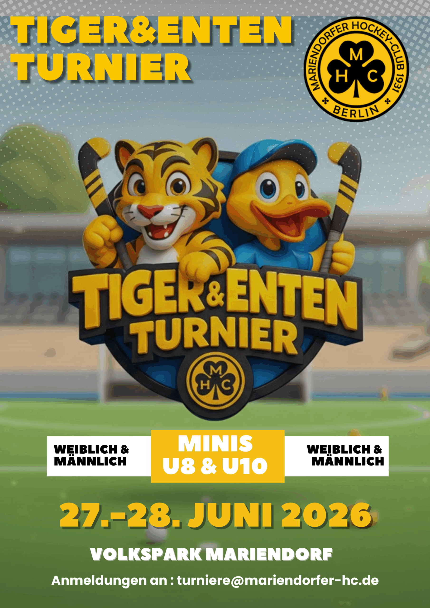Unser traditionelles Tiger & Enten-Turnier findet jedes Jahr kurz vor den Sommerferien statt und ist ein echtes Highlight für die jüngsten MHC-Spieler:innen. Eingeladen sind Teams aus den Altersklassen Minis, U8 & U10 Mädchen und Jungs. In entspannter Atmosphäre, mit viel Spielfreude und tollen Begegnungen, feiern wir gemeinsam den Saisonabschluss – ein Turnier mit Herz, Hockey und ganz viel Spaß!